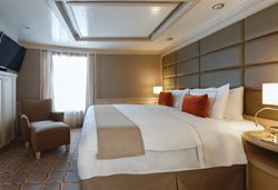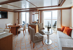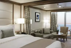 A quiet sanctuary to escape to on your cruise. The sitting area has plenty of room to relax. Large picture windows frame panoramic ocean views. The perfect backdrop for breakfast in bed.Guests can expect a large picture window providing panoramic views, twin beds or queen-sized bed, a shared teak veranda and floor-to-ceiling glass doors, sitting area, a marbled bathroom with double-vanity, a separate shower and a full-sized bathtub. A walk-in wardrobe with personal safe is provided along with a radio/alarm with iPod docking station, direct-dial telephone and a refrigerator and bar setup, stocked with your preferences. Pratesi® fine bed linens and down duvet covers, premium mattresses and a choice of pillows, Plush robes and slippers, BVLGARI® bath amenities or a choice of European bath amenities, vanity table(s) with hair dryer, writing desk(s) with personalised stationery, binoculars, and umbrella, WiFi access, flat screen TV(s), on-demand movies, and satellite news, and dry cleaning and pressing service (fee applies).