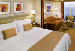 One Bedroom: 990 sq ft / 92m2 including veranda (129 sq ft / 12m2)Two Bedroom: 1,366 sq ft / 127m2 including veranda (194 sq ft / 18m2) Large teak veranda with patio furniture and floor-to-ceiling glass doors; two-bedroom has additional veranda Living room (with convertible sofa to accommodate an additional guest) Sitting area; two-bedroom has additional sitting area Separate dining area Twin beds or queen-sized bed; two-bedroom has additional twin beds or queen-sized bed Marbled bathroom with double vanity, separate shower and full-sized whirlpool tub, plus a powder room; two-bedroom has additional marbled bathroom with full-sized bath Walk-in wardrobe(s) with personal safe Vanity table(s) with hair dryer Writing desk(s) Flat screen television(s) with interactive video, on-demand movies and music, and satellite news programming Bang & Olufsen audio system Radio/Alarm with iPod docking station Direct-dial telephone